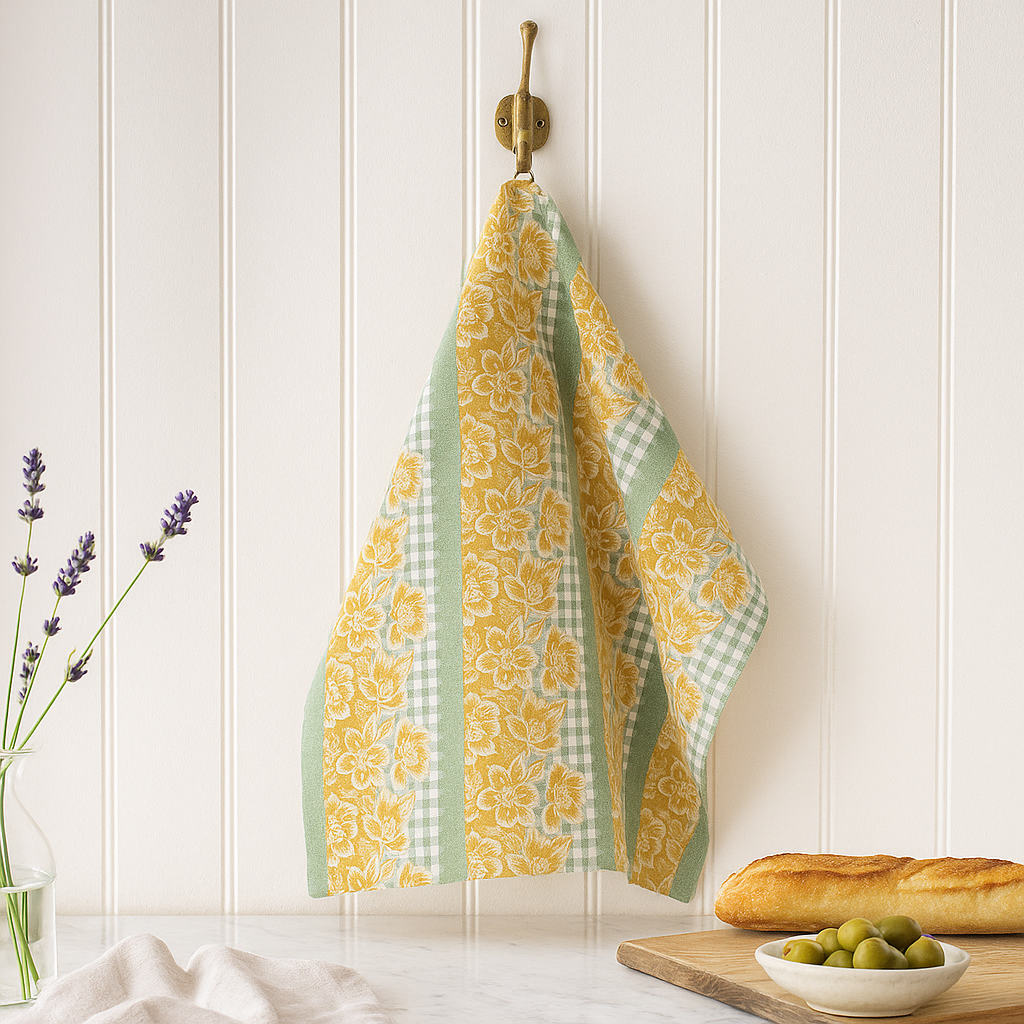 Torchon floral et vichy vert – Élégance champêtre pour une cuisine raffinée